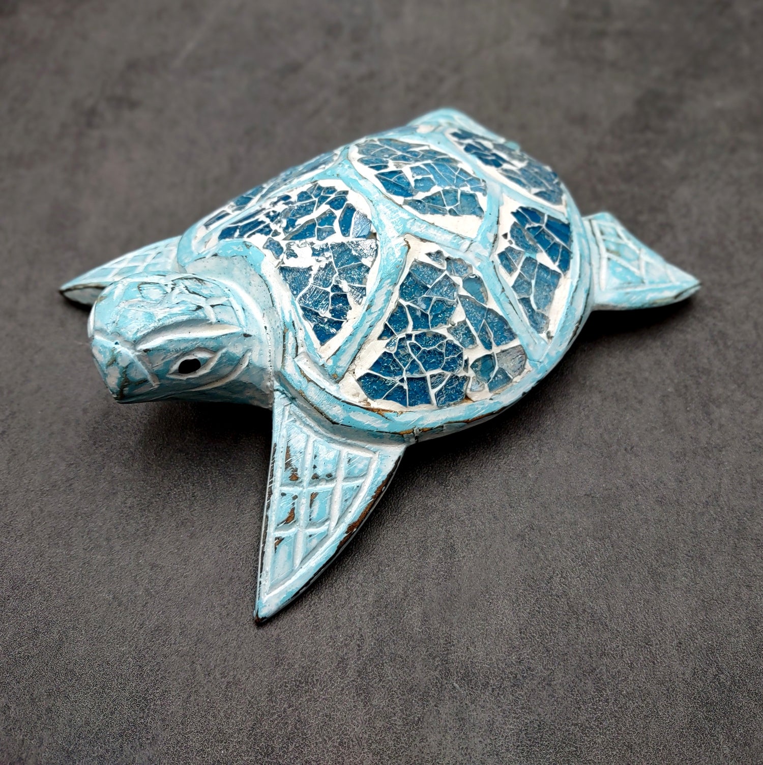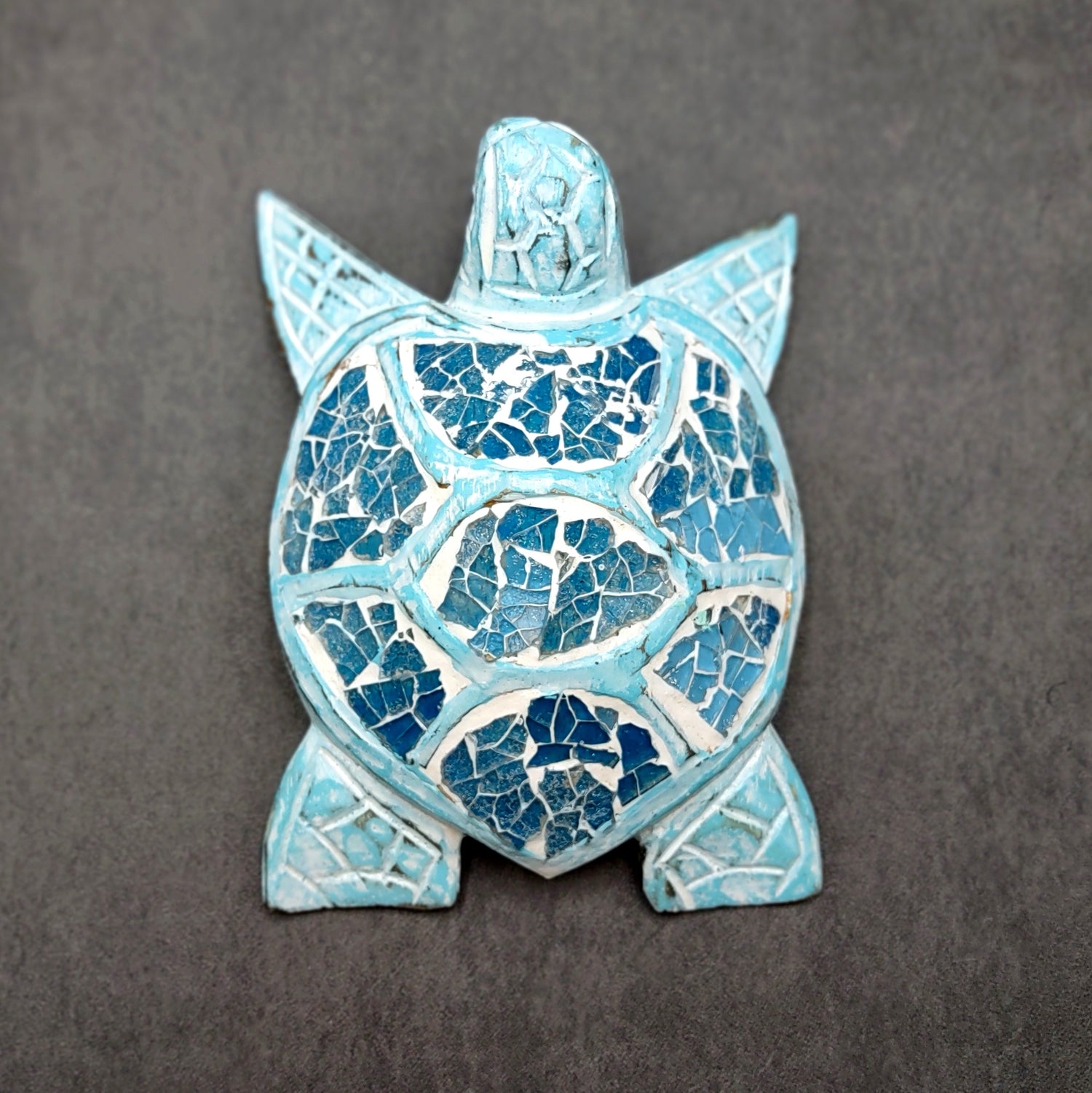 - Wooden Blue Green Sea Glass Mosaic Sea Turtle Figurine