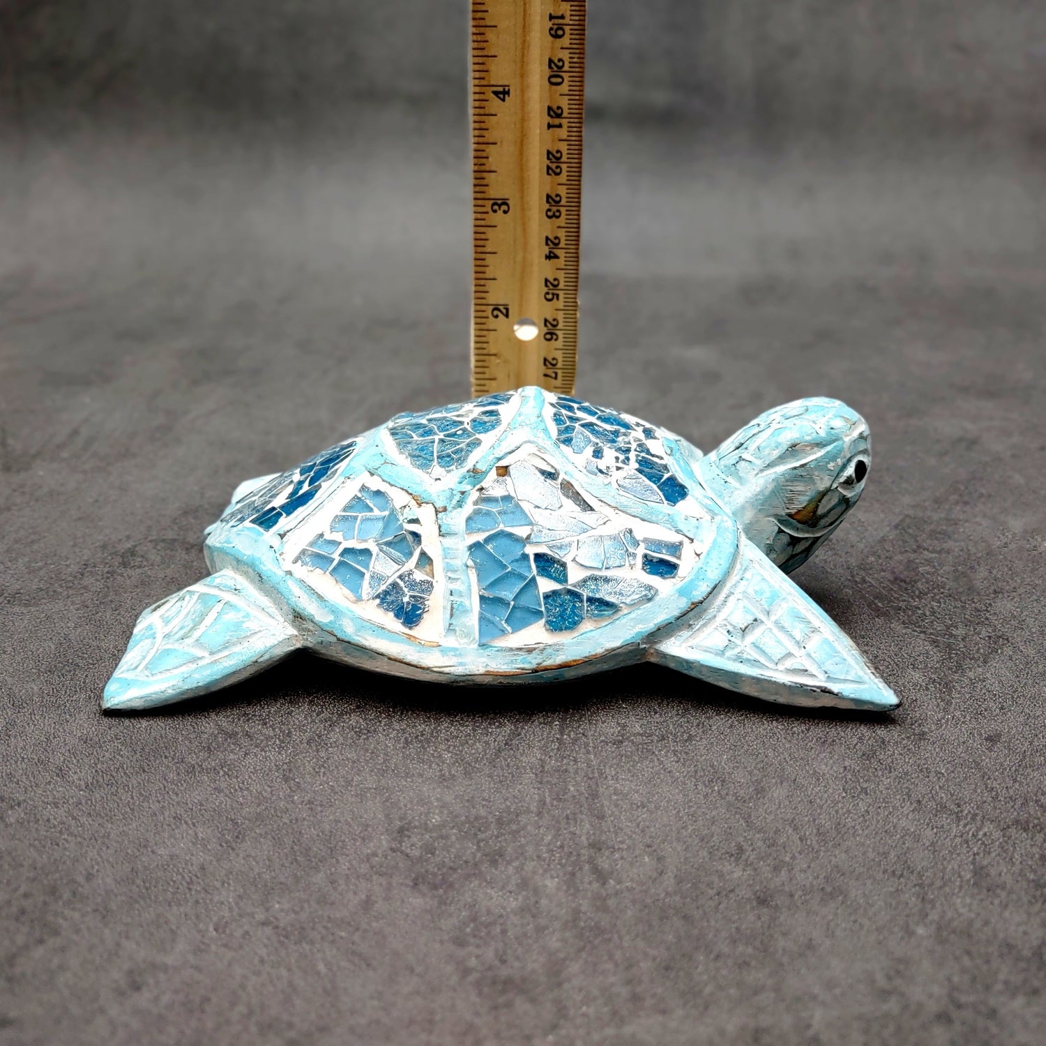 Blue Wood Sea Turtle Sea Glass Shell Figurine (1 figure approx. 6+ inches long) Mosaic Sea Glass Shell Wood Sea Turtle for home decor!