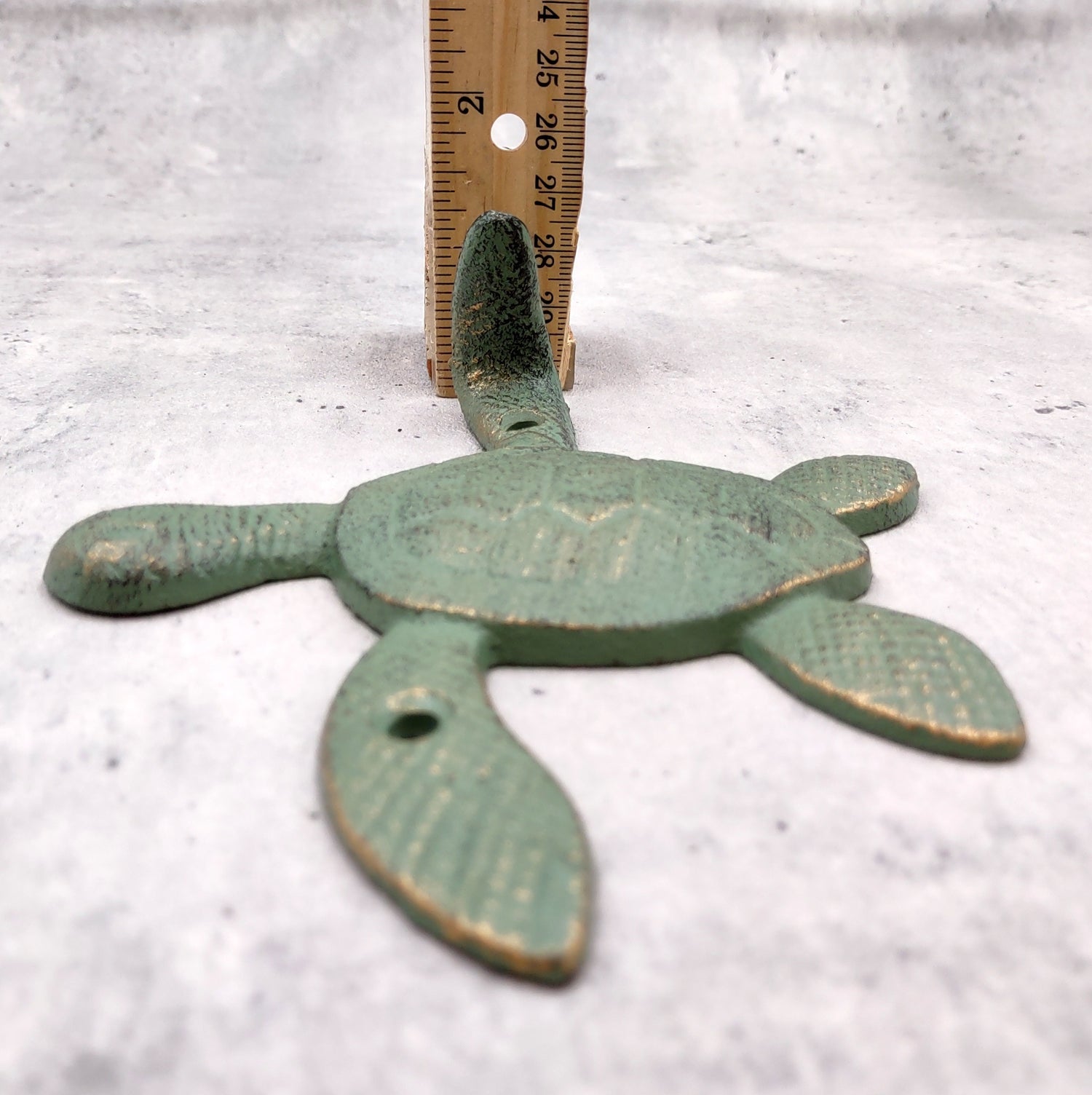 Cast Iron Green Patina Sea Turtle Wall Hook (1 cast iron hook approx. 6+ inches) Verdigris Sea Turtle Wall Hanger for coastal home decor!