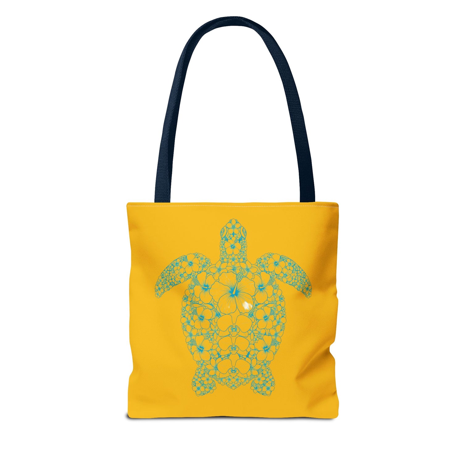 Gold and Teal Tropical Flower Sea Turtle Tote Bag, Eco-Friendly Shopping Bag, Summer Beach Bag, Animal Lover Gift, Cute Tote for Kids & Adults