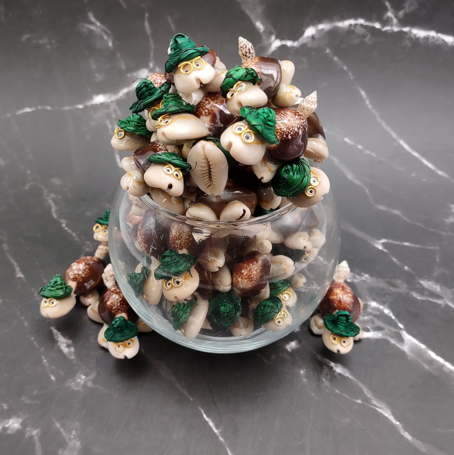 Bring playful charm to your collection with our Set of 3 Seashell Novelty Sea Turtles, featuring adorable sea turtles adorned with green hats and glasses. Each handcrafted sea turtle is made from real seashells, including genuine cowrie shells, carefully assembled to create whimsical seaside characters. The green hats and stylish glasses add a fun, quirky touch, making these sea turtles perfect for coastal decor, gifts, or conversation starters.