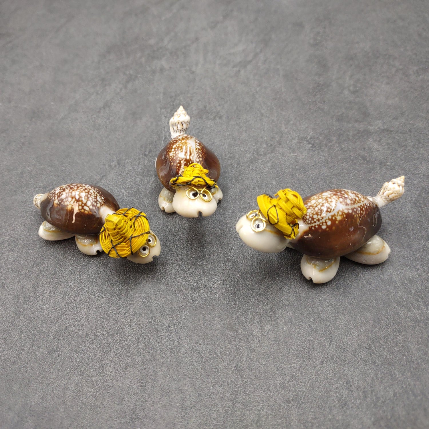 Cowrie Shell Sea Turtle Figurines Yellow Hat (3 figures approx. 2+ inches) Cute Cowrie Seashell Sea Turtles for gifts decor & display!