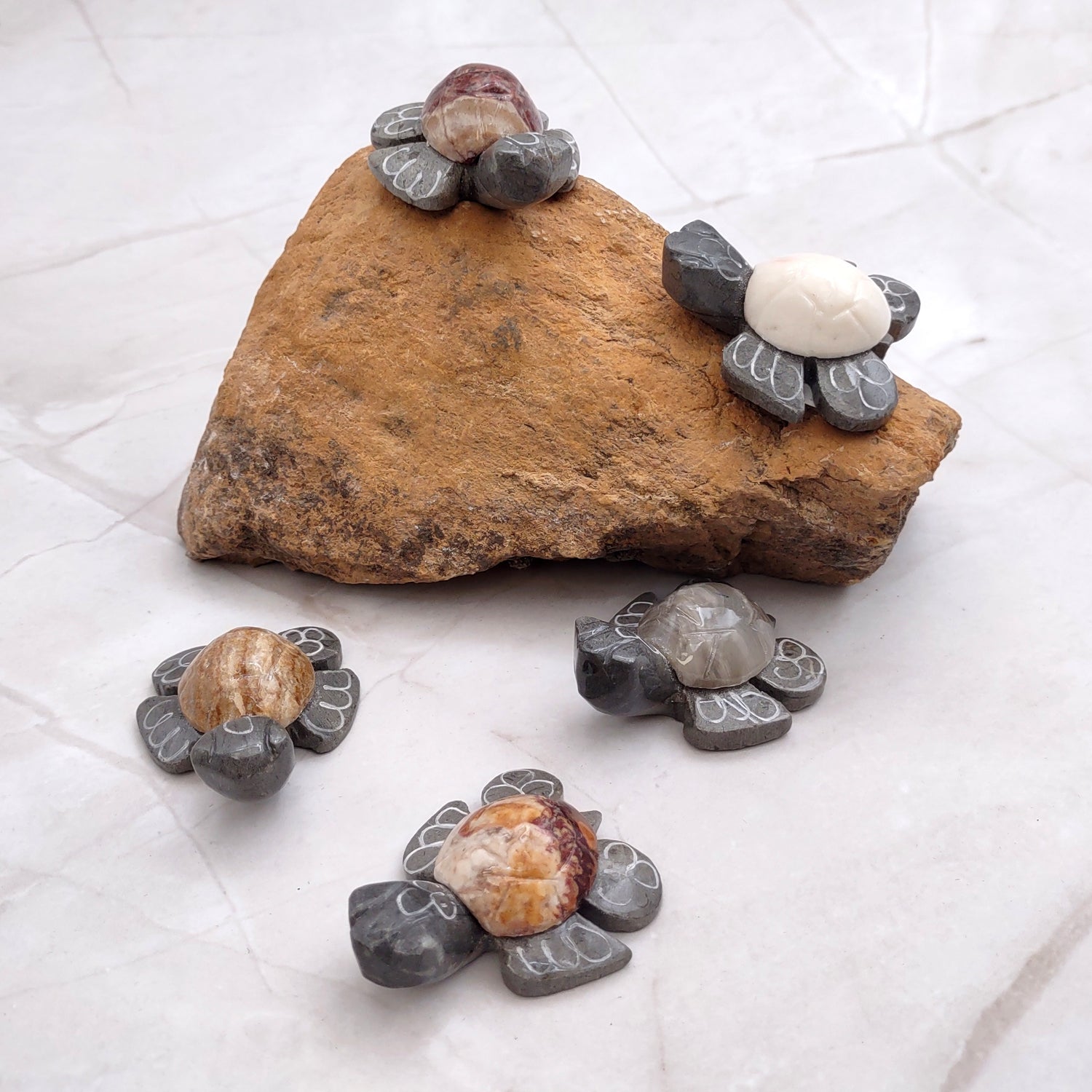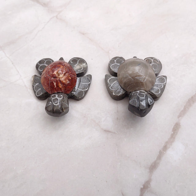 Enhance your space with our Beautiful Natural Marble Stone Turtles sold in sets of two. Crafted from assorted natural tones of marble stone, each turtle measures approximately 2 inches in size, making them perfect for display on shelves, tables, or as part of your garden or indoor centerpiece. Their unique natural variations in color and texture add a touch of rustic charm and individuality to each set, making every piece truly one of a kind.