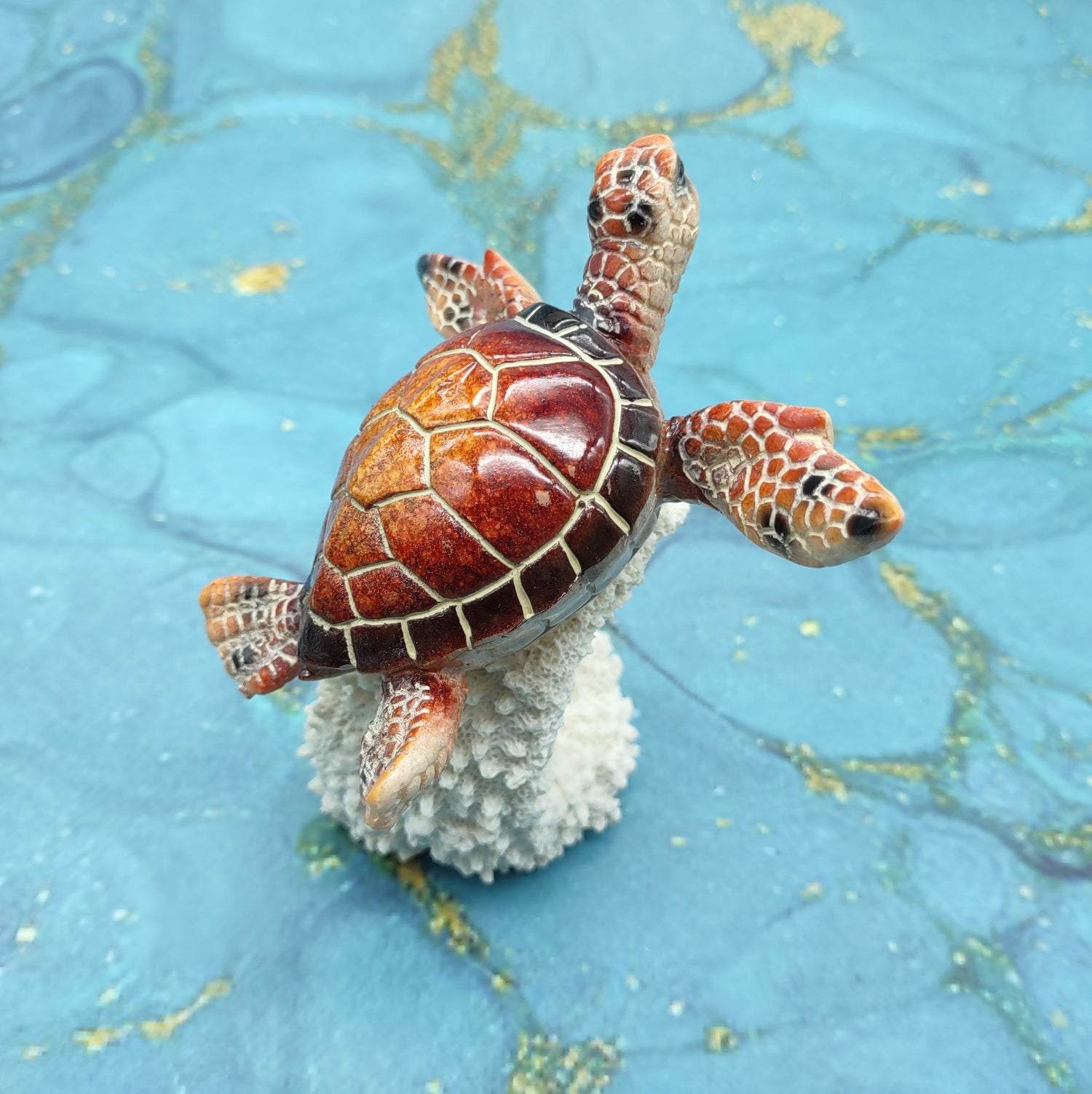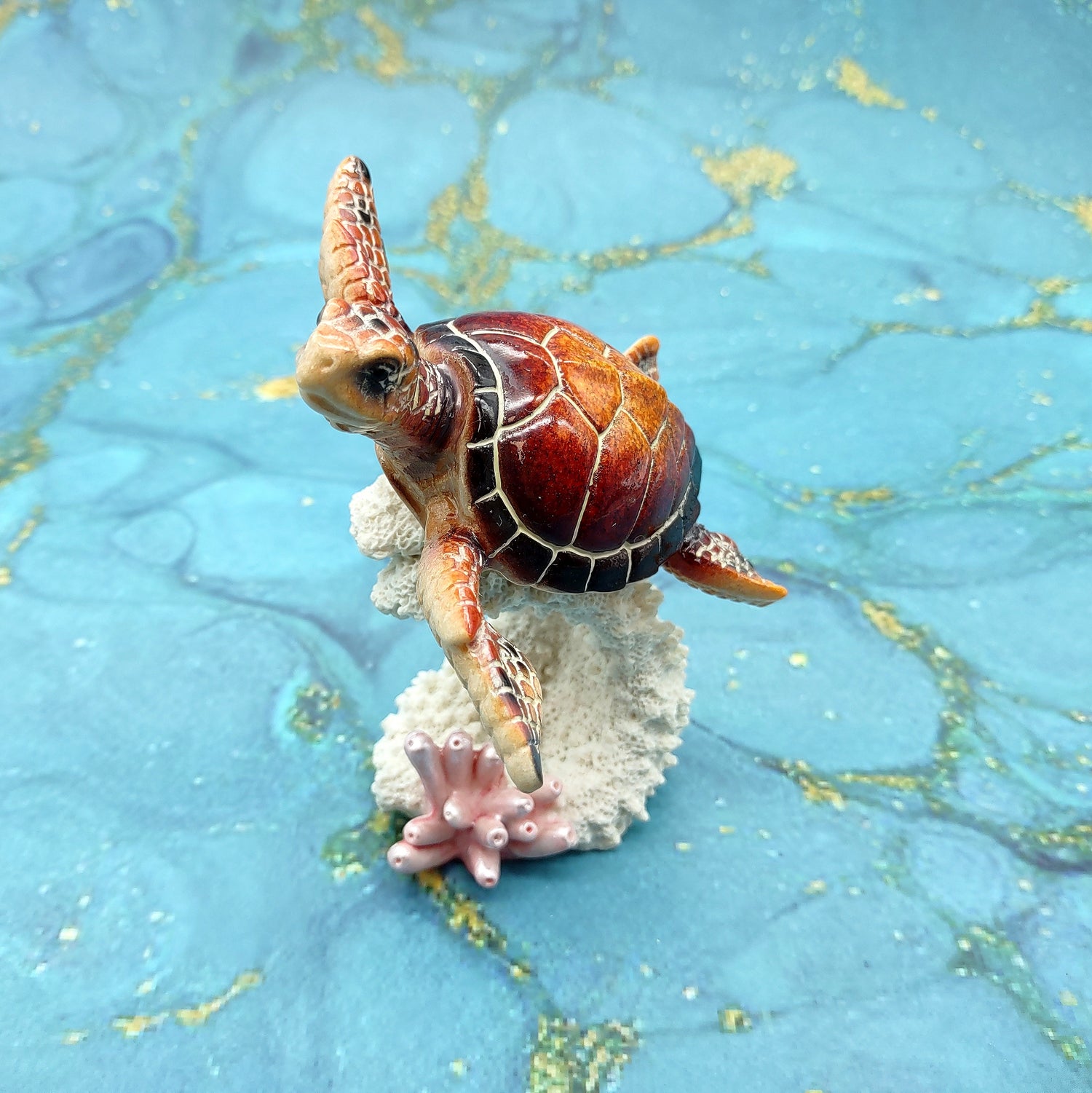 This charming sea turtle figurine features vibrant shades of crimson red and sunny yellow, capturing the lively spirit of ocean life. The turtle appears to glide gracefully across a beautifully detailed piece of ocean coral, adding a dynamic sense of movement to the piece. Every scale on the turtle’s shell is carefully painted with shimmering accents that catch the light, while its gentle, inquisitive expression evokes feelings of adventure and calmness. This piece