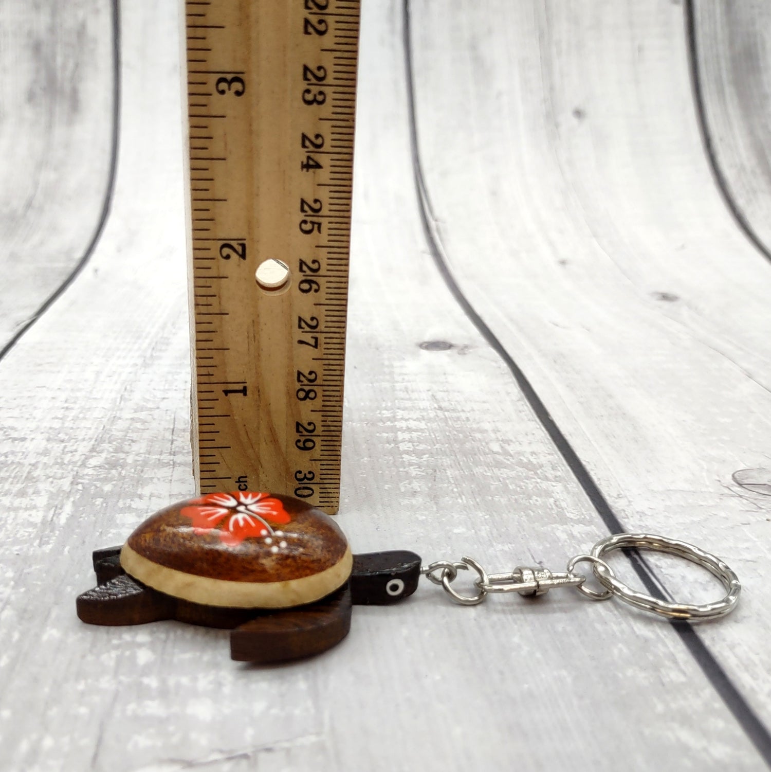 Orange Hibiscus Painted Wooden Sea Turtle Keychain (1 keychain approx. 4.25+ inches) Wooden Sea Turtle Key Fob for gifting or party favors!