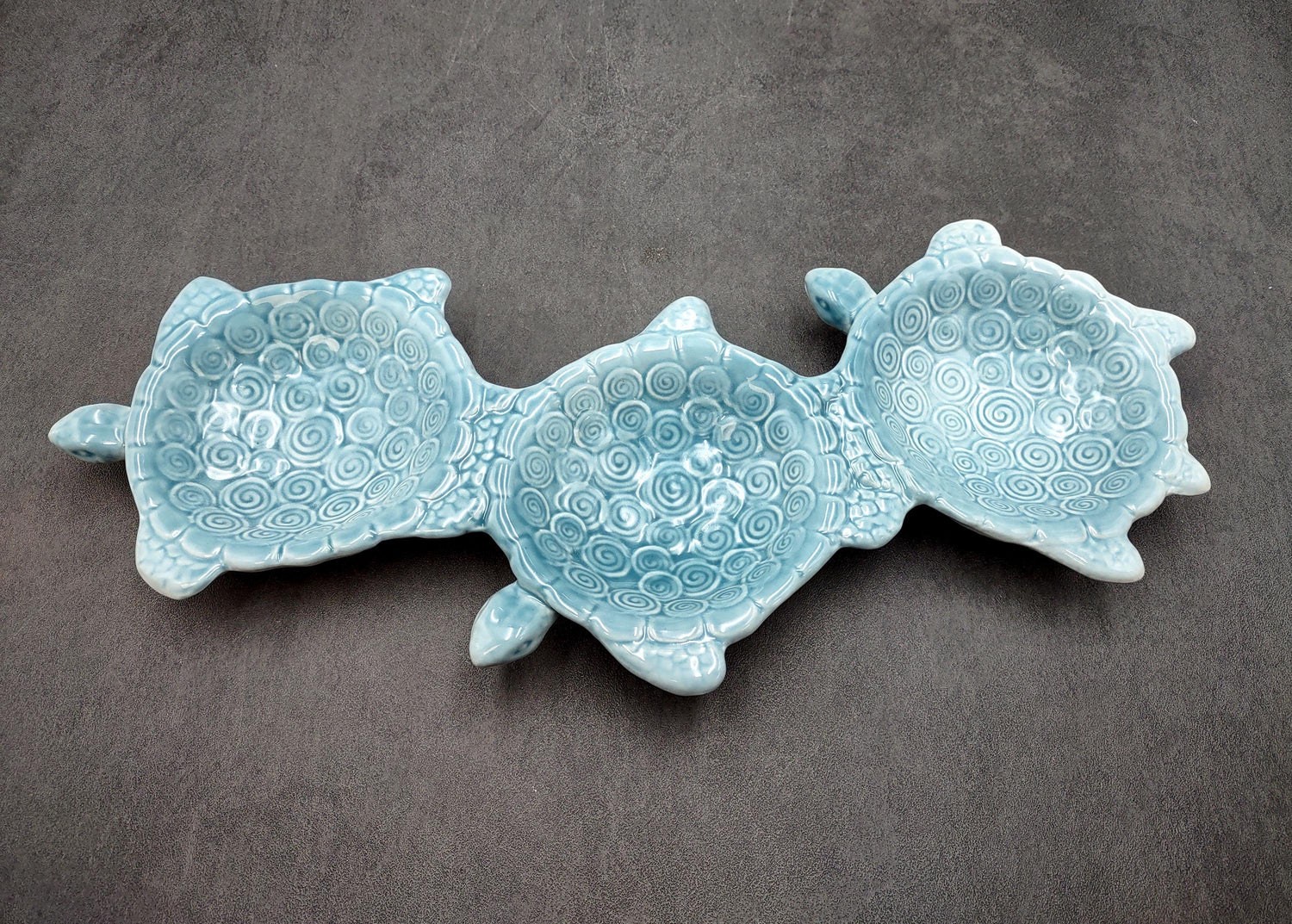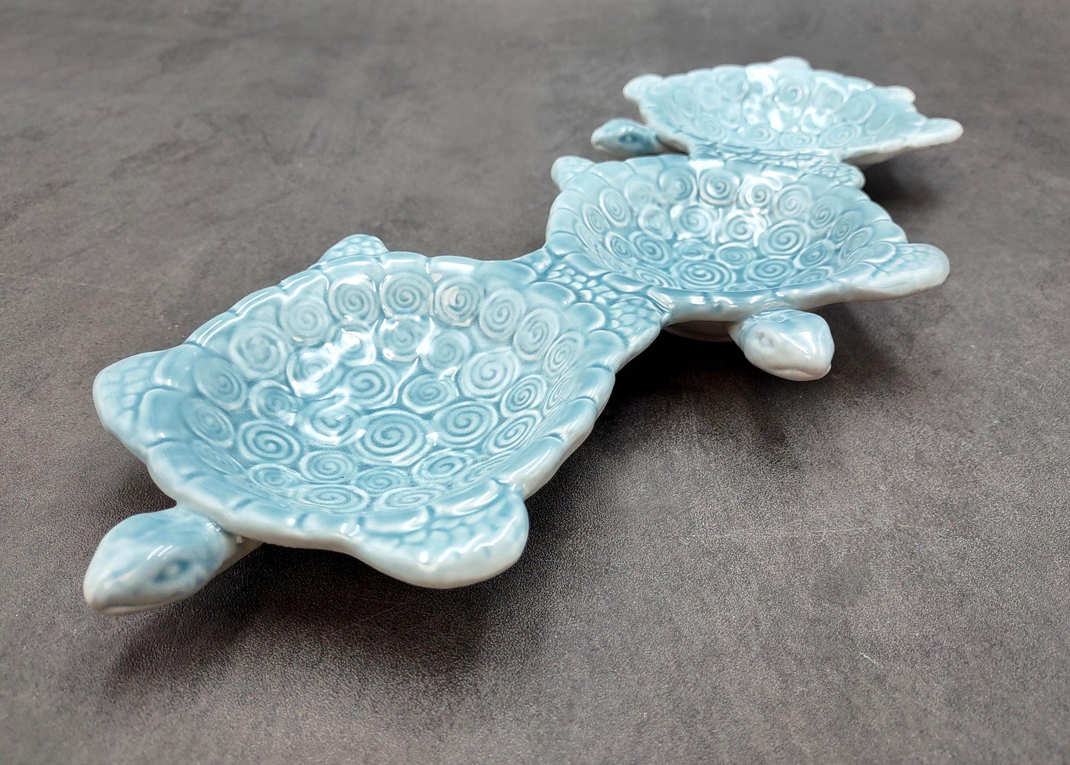 Add a touch of ocean-inspired charm to your home with our Sea Turtle Connected Trio Dish. Crafted with attention to detail, this beautiful ceramic dish features three interconnected sea turtles, symbolizing unity and tranquility. Its coastal design and soothing aqua blue color make it an ideal decorative piece or functional catch-all tray for keys, jewelry, or small essentials.