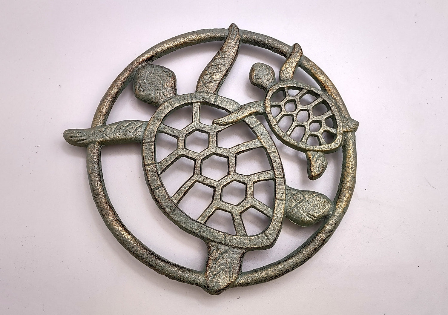 Sea Turtle Trivet Cast Iron Green Gold Weathered Hot Pad (1 trivet approx. 7 inches) Green Sea Turtle Pair Trivet for coastal dining table!