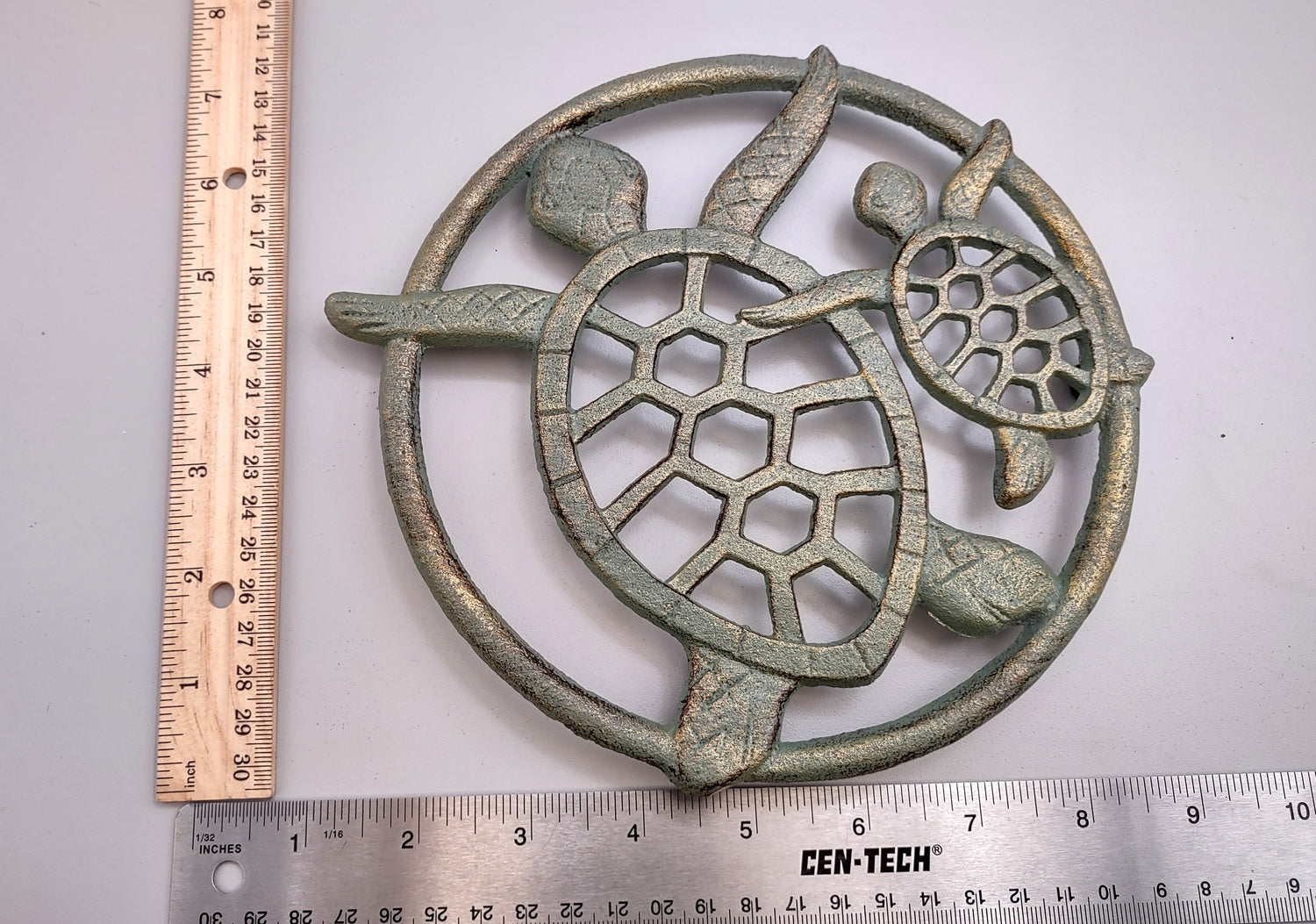 Sea Turtle Trivet Cast Iron Green Gold Weathered Hot Pad (1 trivet approx. 7 inches) Green Sea Turtle Pair Trivet for coastal dining table! is backordered and will ship as soon as it is back in stock.