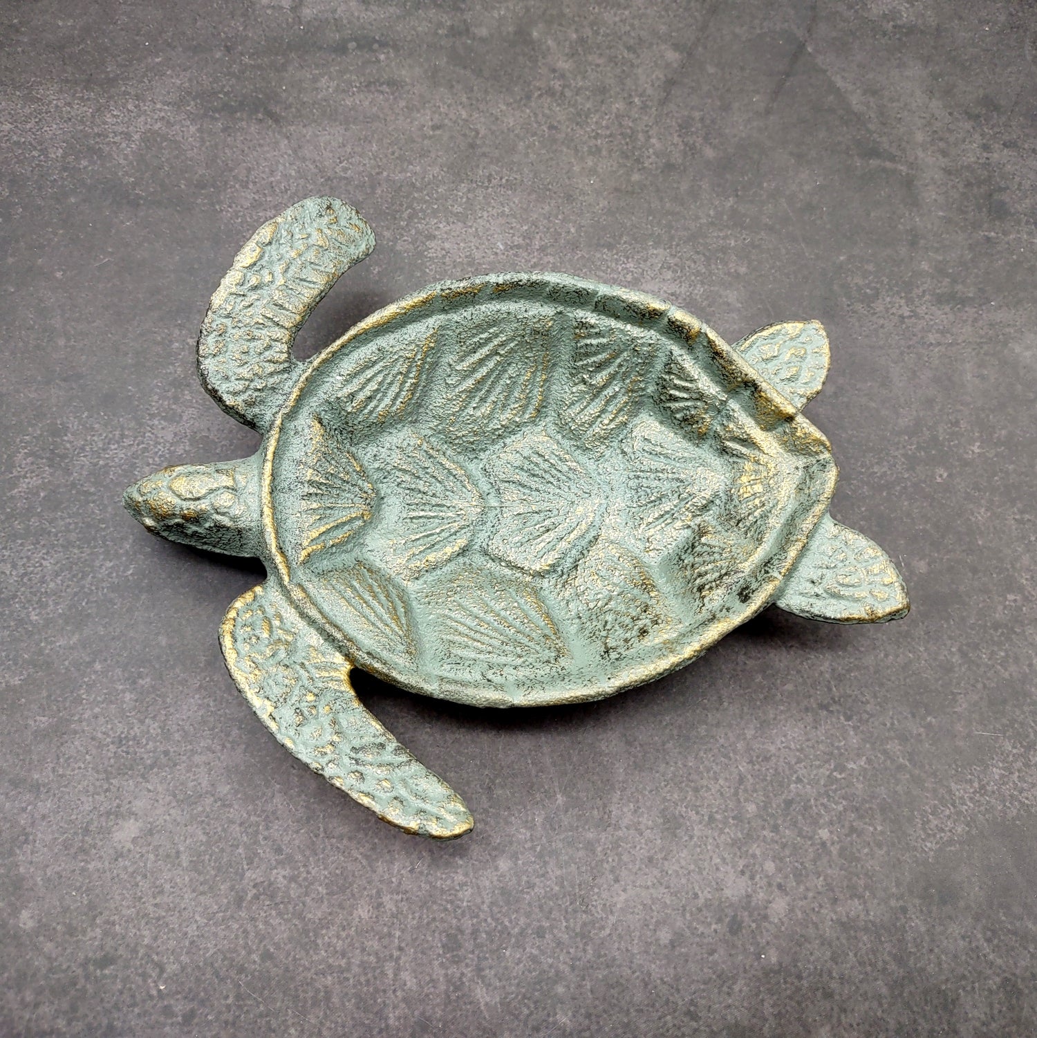 Cast Iron Sea Turtle Green Metal Dish (1 bowl approx. 7+ inches) Green Metal Sea Turtle Dish for jewelry trinkets & home décor! is backordered and will ship as soon as it is back in stock.