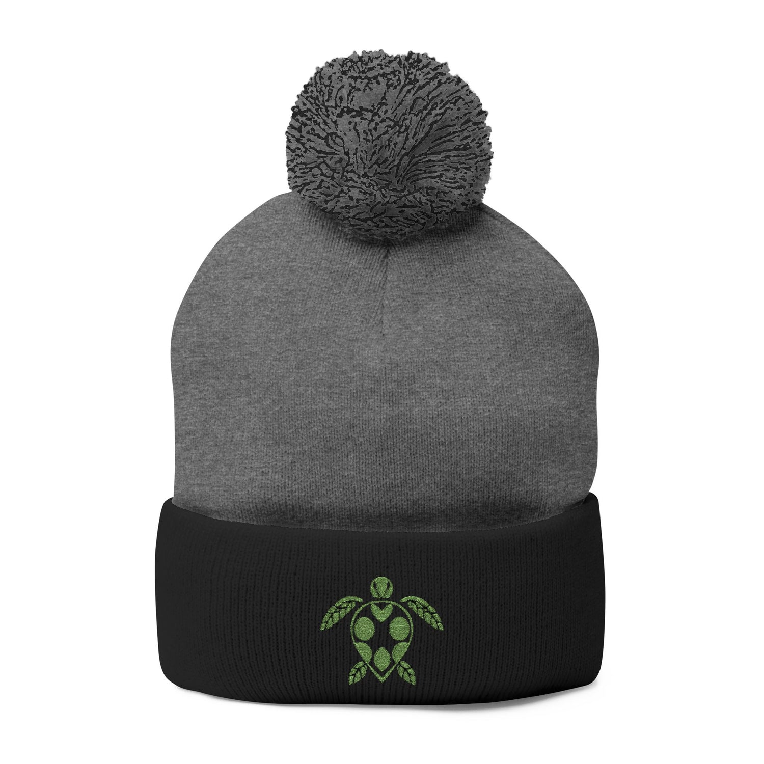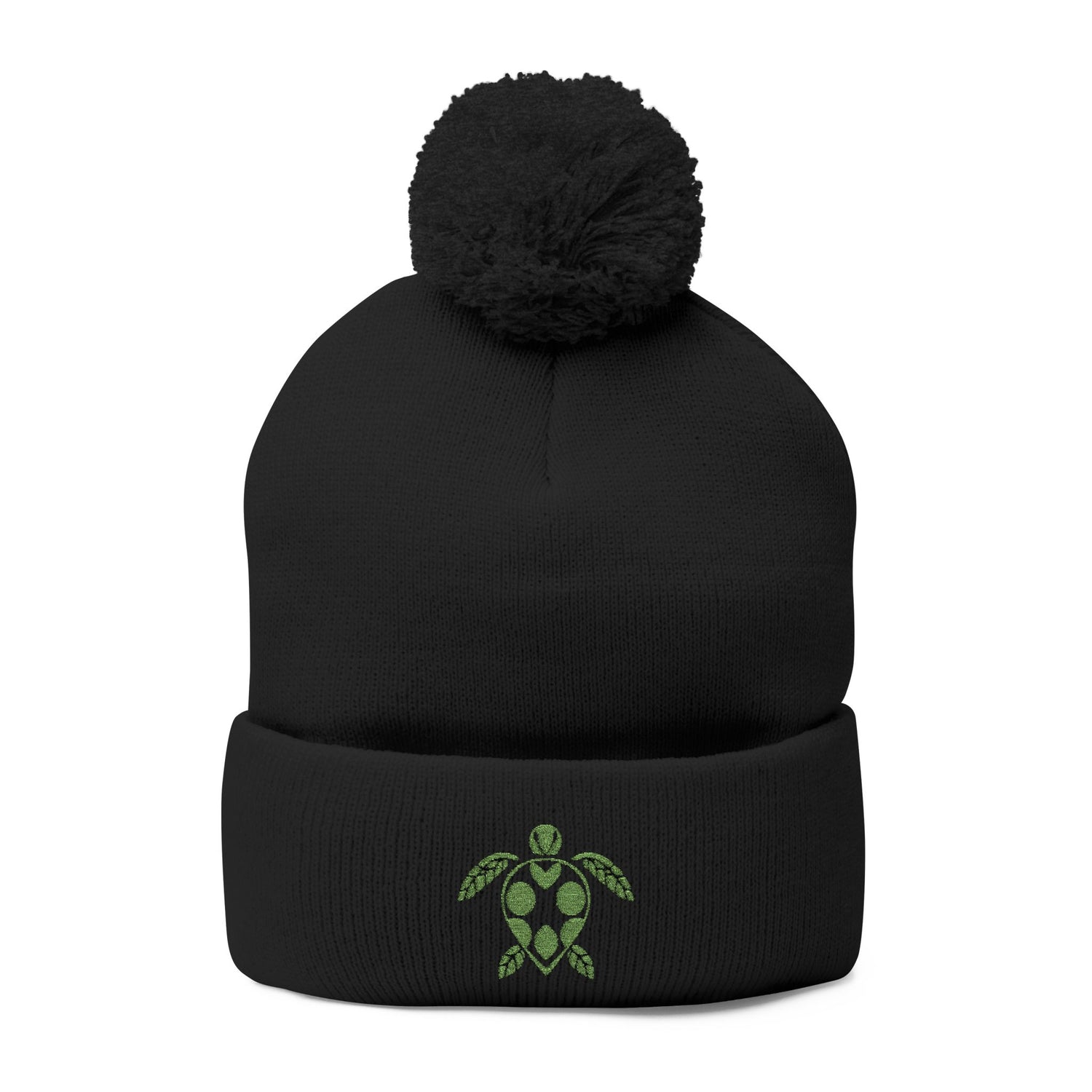 Cozy Pom-Pom Knit Cap with Green Sea Turtle Embroidery - One size / Black is backordered and will ship as soon as it is back in stock.