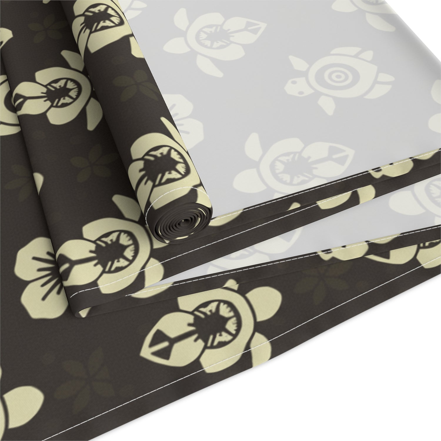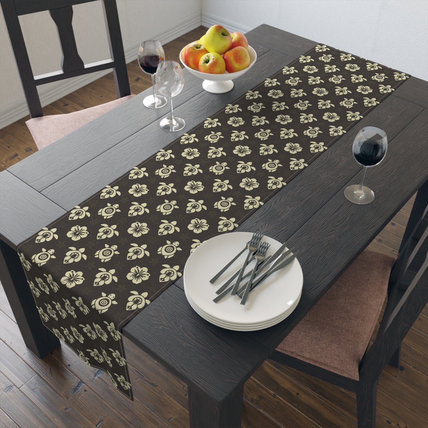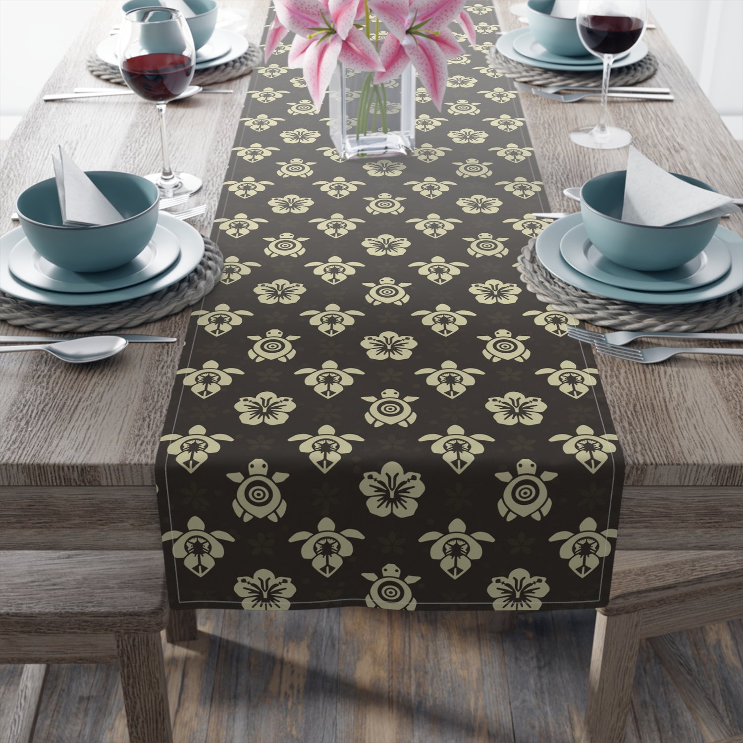 Dark Brown Sea Turtle and Floral Print Table Runner - 16" × 72" / Cotton Twill is backordered and will ship as soon as it is back in stock.