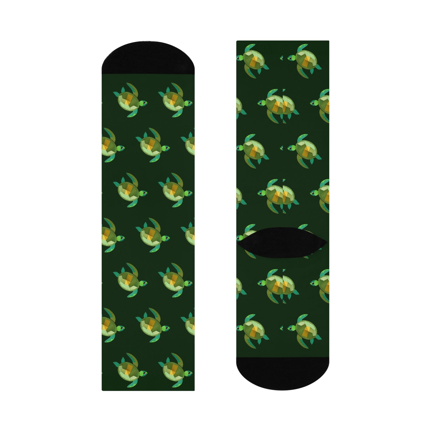 Dark Green Geopattern Sea Turtle Cushioned Crew Socks - Fun Animal Design for Turtle Lovers, Gift for Birthdays, Casual Wear, Comfortable Socks