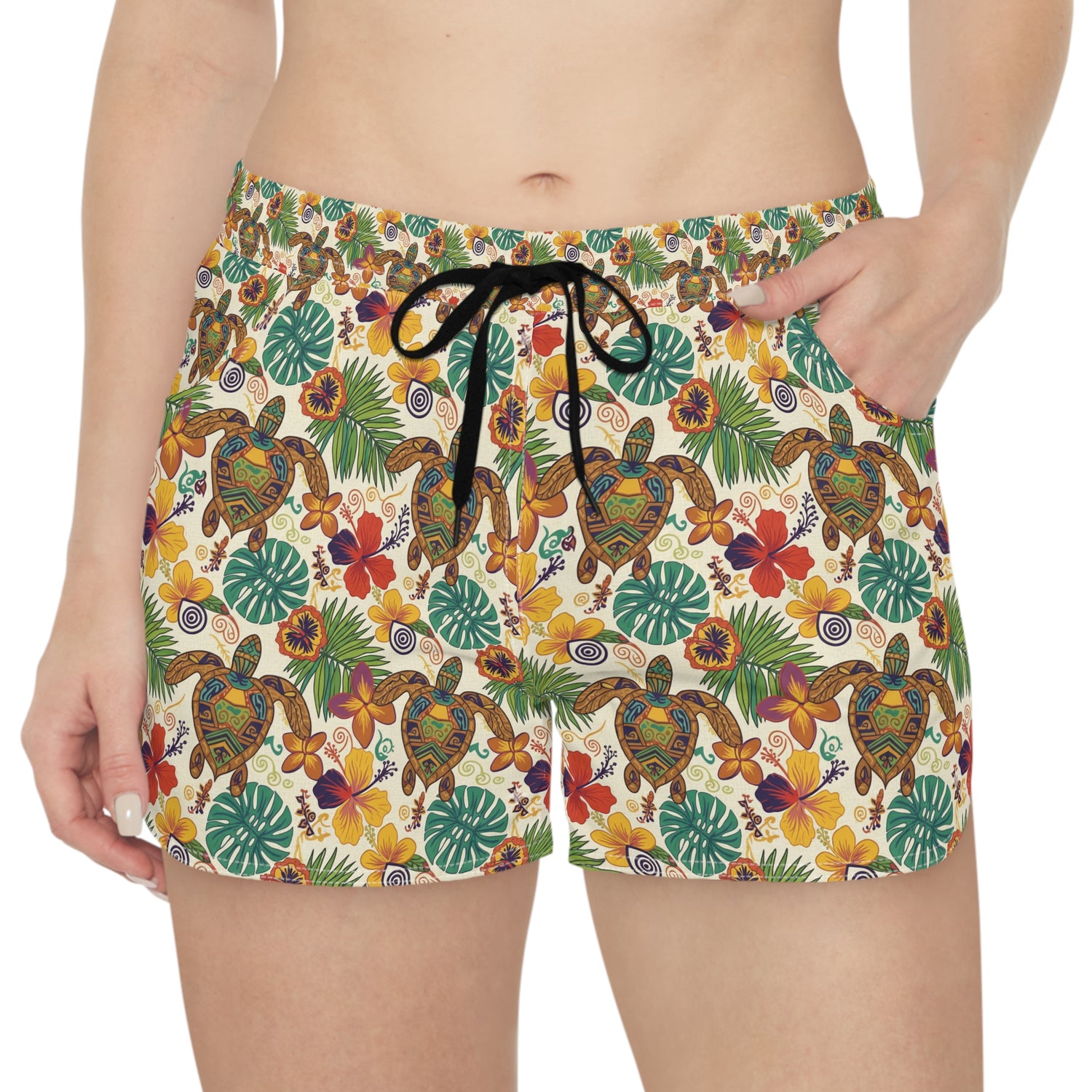 Retro Tropical Sea Turtle Print Womens Shorts - S / Black drawstring is backordered and will ship as soon as it is back in stock.