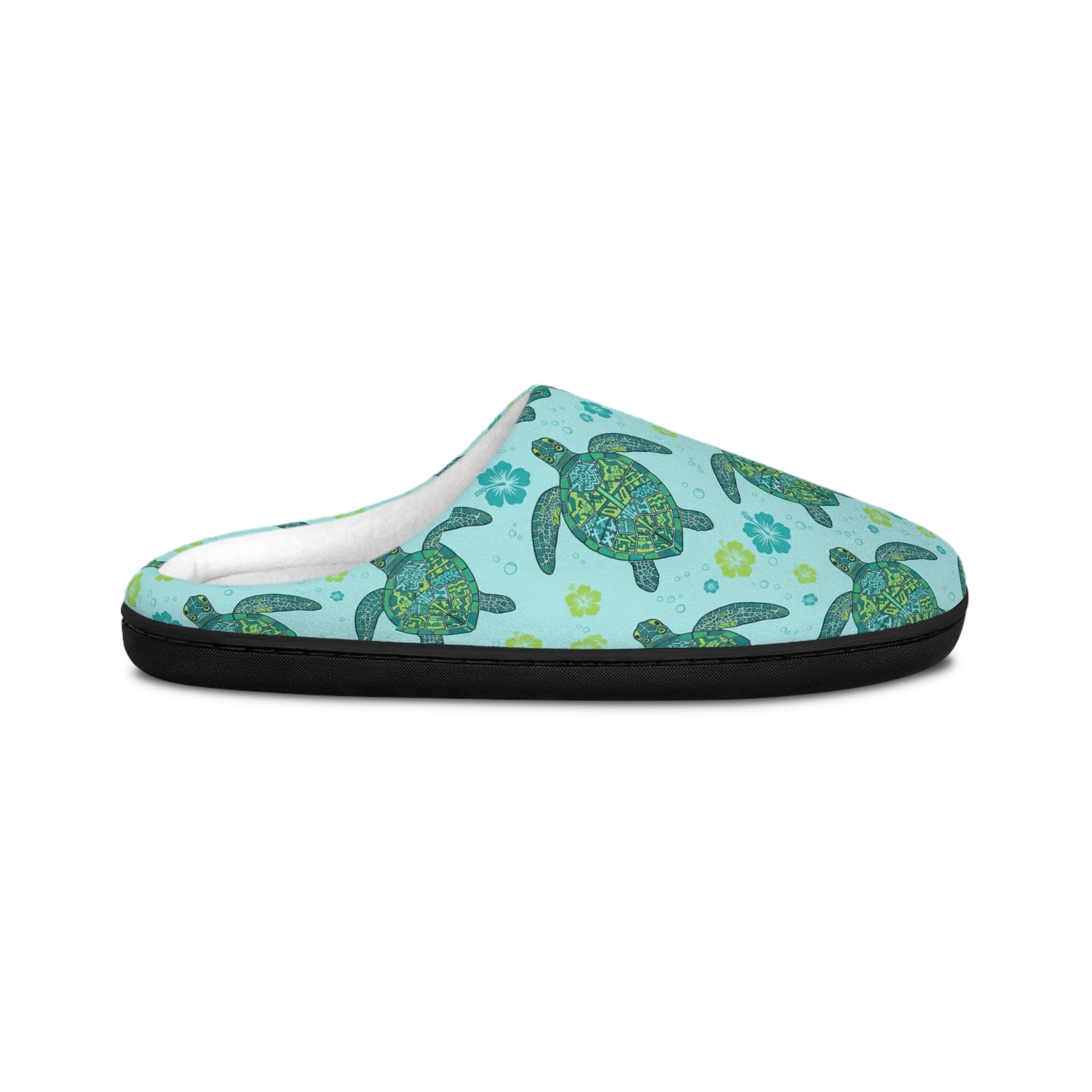Womens Blue Tropical Sea Turtle Print Indoor Slippers - US 7 - 8 / Black sole is backordered and will ship as soon as it is back in stock.